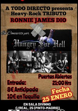 VEN A DISFRUTAR DE UNA NOCHE DE PURO HEAVY METALEN DIRECTO, DONDE RENDIREMOS CULTO AL GRAN RONNIE JAMES DIO, INTERPRETANDO LOS MEJORES TEMAS DE SU TRAYECTORIA, EN SU PASO POR LAS MÍTICAS BANDAS RANIBOW, BLACK SABBATH Y DIO.