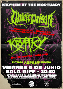 Y cómo no, estaremos enormemente acompañados por los panas malagueños de Krypticy con su death metal acelerado y bien afilado como un buen machete. Estarán dando buena cuenta no sólo de sus trabajazos hasta la fecha (Necronomicon y Hideous Being) y quizás nos deleiten con algún temita nuevo de su próxima obra de studio. El cuál, estamos deseando pegar tímpanos y dejarlos sangrar.
