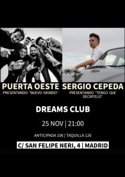 SERGIO CEPEDA (@_SergioCepeda) Y PUERTA OESTE (@puertaoeste) Actuarán en la Sala Dreams de Madrid este 25 de Noviembre. Lo harán presentando sus últimos respectivos trabajos (Tengo que decírtelo y Nuevo mundo) en la que será una noche de rock con estas dos Bandas extremeñas.