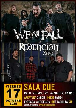 Evento inédito en la histórica Villa de Aranjuez con sus dos bandas locales más representativas de la escena metal nacional. Por un lado tenemos a Redención Zero que tras 8 años de andadura presentarán su reciente álbum ´Megalomanía´. Y como colofón tendremos la primera actuación en 4 años de unos clásicos arancetanos como We All Fall. El próximo año cumplen su 20 aniversario de trayectoria musical y vienen a presentar nuevas canciones que formarán parte de su inminente nuevo álbum ´Tales From A Dying Sun´.