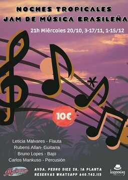 Noches Tropicales. Jam de Música Brasileña tendrá su sesión inicial el próximo miércoles 20 de octubre. Noches Tropicales. Jam de música Brasileñaes una jam de música instrumental brasileña. En esta jam, dirigida por la flautista brasileña Leticia Malvares, podremos conocer la gran variedad de estilos y músicos de Brasil que son muy desconocidos aquí en España y que están configurando la escena contemporánea del jazz brasileño. En esta jam también se interpretarán temas propios que fusionan el jazz y los ritmos más genuinos brasileños con otras músicas del mundo e incluso flamenco.