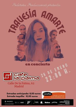 Concierto de Travesía Amarte donde tocaran los temas de su primer disco “Bestias y Fantasmas”. Trabajo en el que han decidido el rumbo de cada nota desde el primer momento. Sintetizadores retro, coros envueltos en delay, guitarras acústicas de caoba, pianos solemnes, baterías singerland, guitarras eléctricas intimistas y bajos Fender de la Motown que se juntan en la intimidad de la voz de Verónica Navly para dar forma a diez canciones autoproducidas para conseguir melodías con vistas…